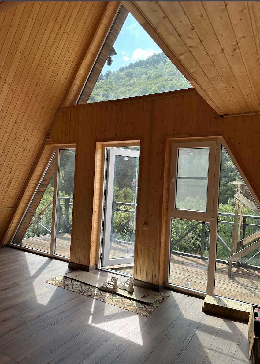 -Окна: ПВХ Elex, однокамерные, профиль 60, ламинация с одной стороны. Окна при установке утапливаются в зону каркаса и утепления.