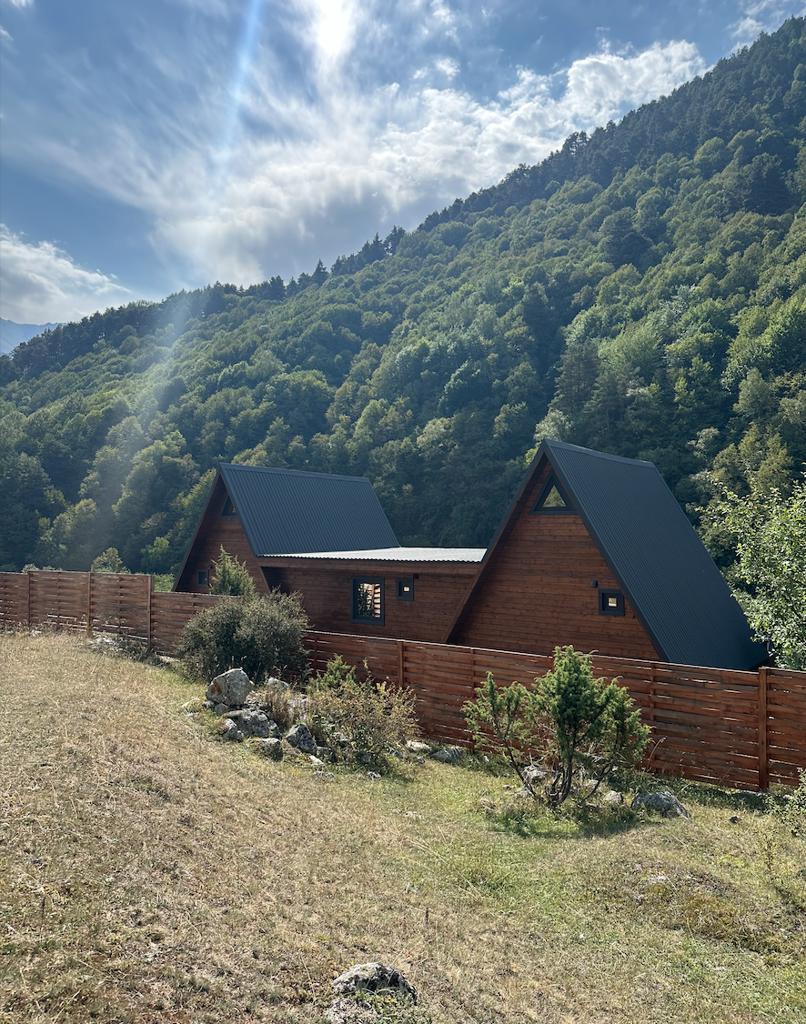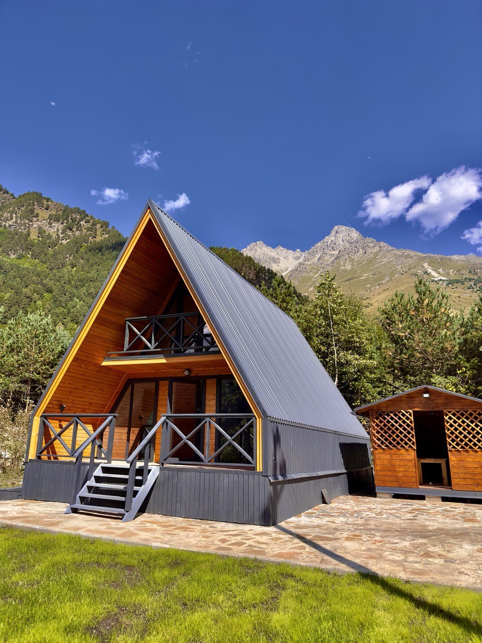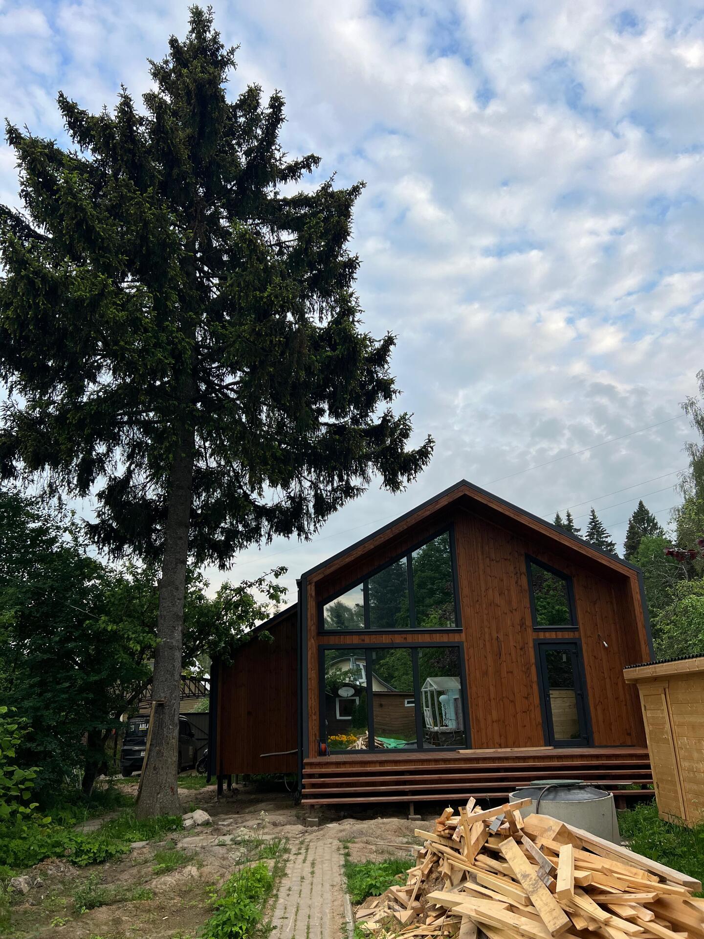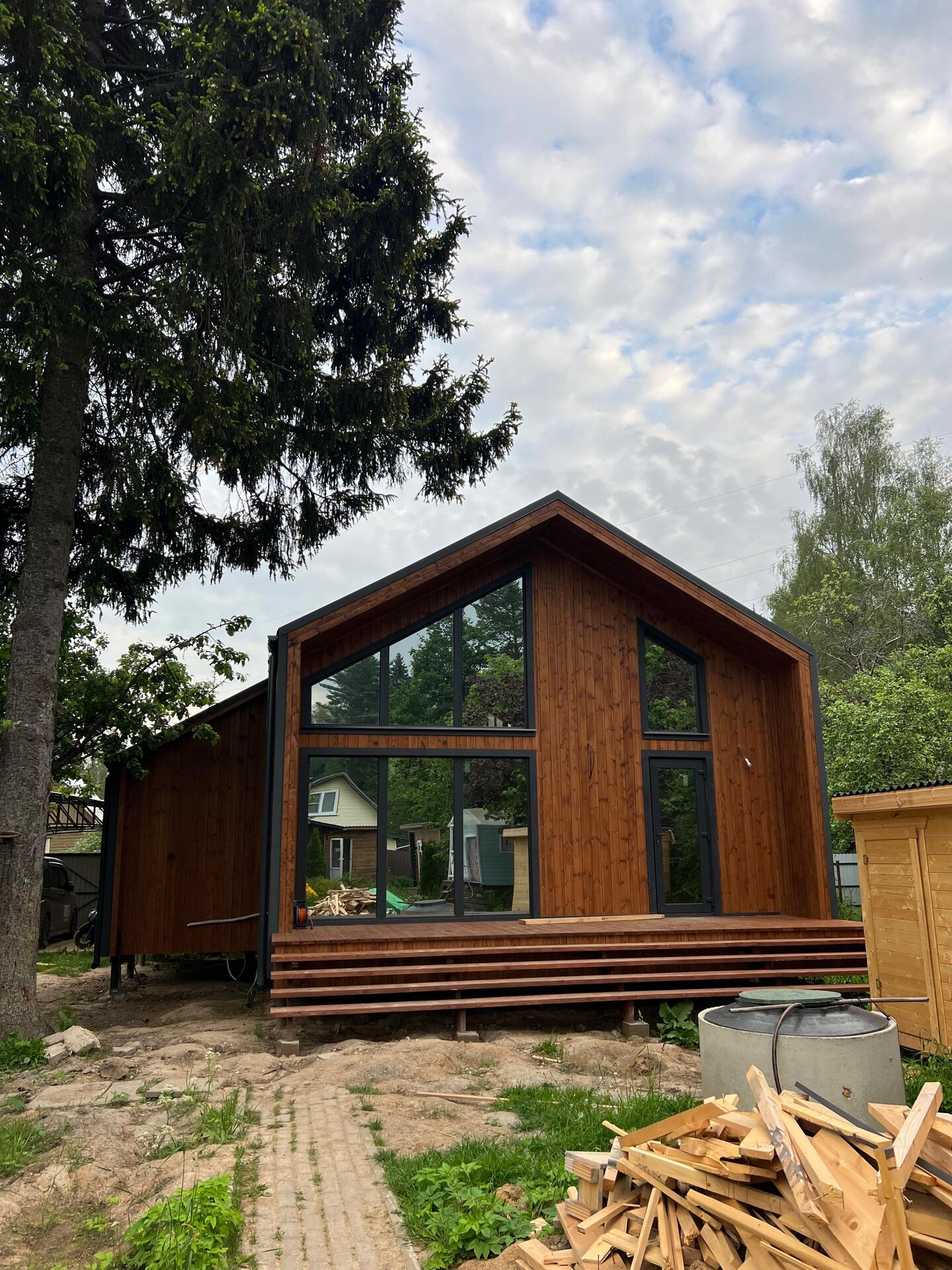 -Кровля: профнастил, толщиной̆ 0,45 мм пошаговой̆ обрешётке с шагом 40 см- 50см, через гидро-ветрозащиту и контррейку 40мм. Цвет 7024 (серый̆ графит мат).