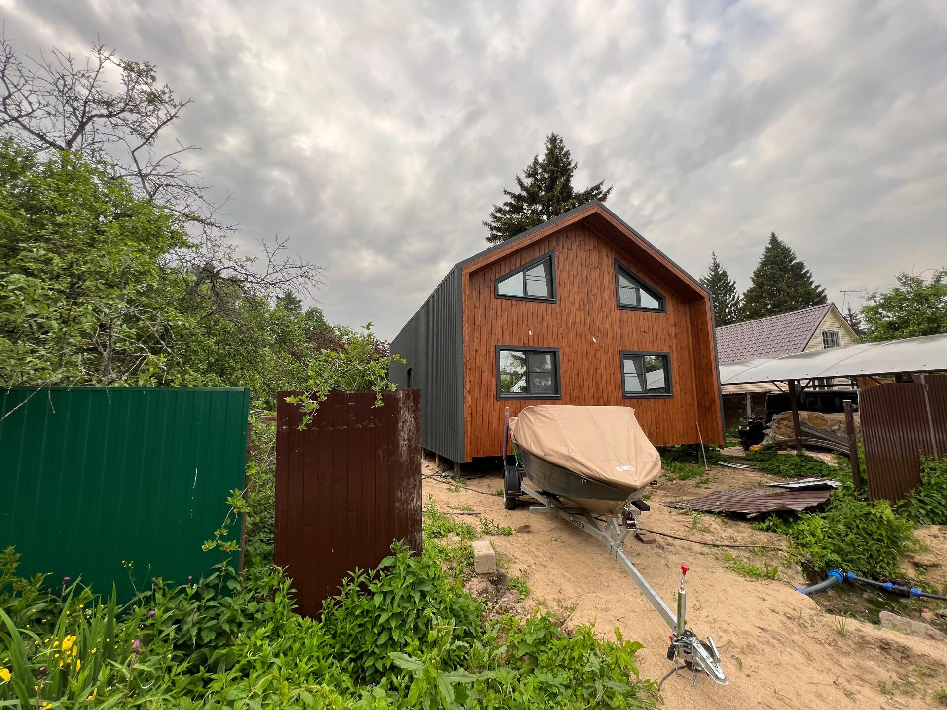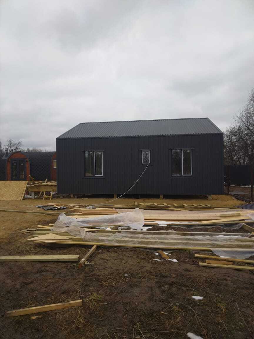 - Кровля: профнастил, толщиной̆ 0,45 мм по шаговой̆ обрешётке с шагом 40 см- 50см, через гидро-ветрозащиту и контррейку 40мм. Цвет 7024 (серый̆ графит мат).