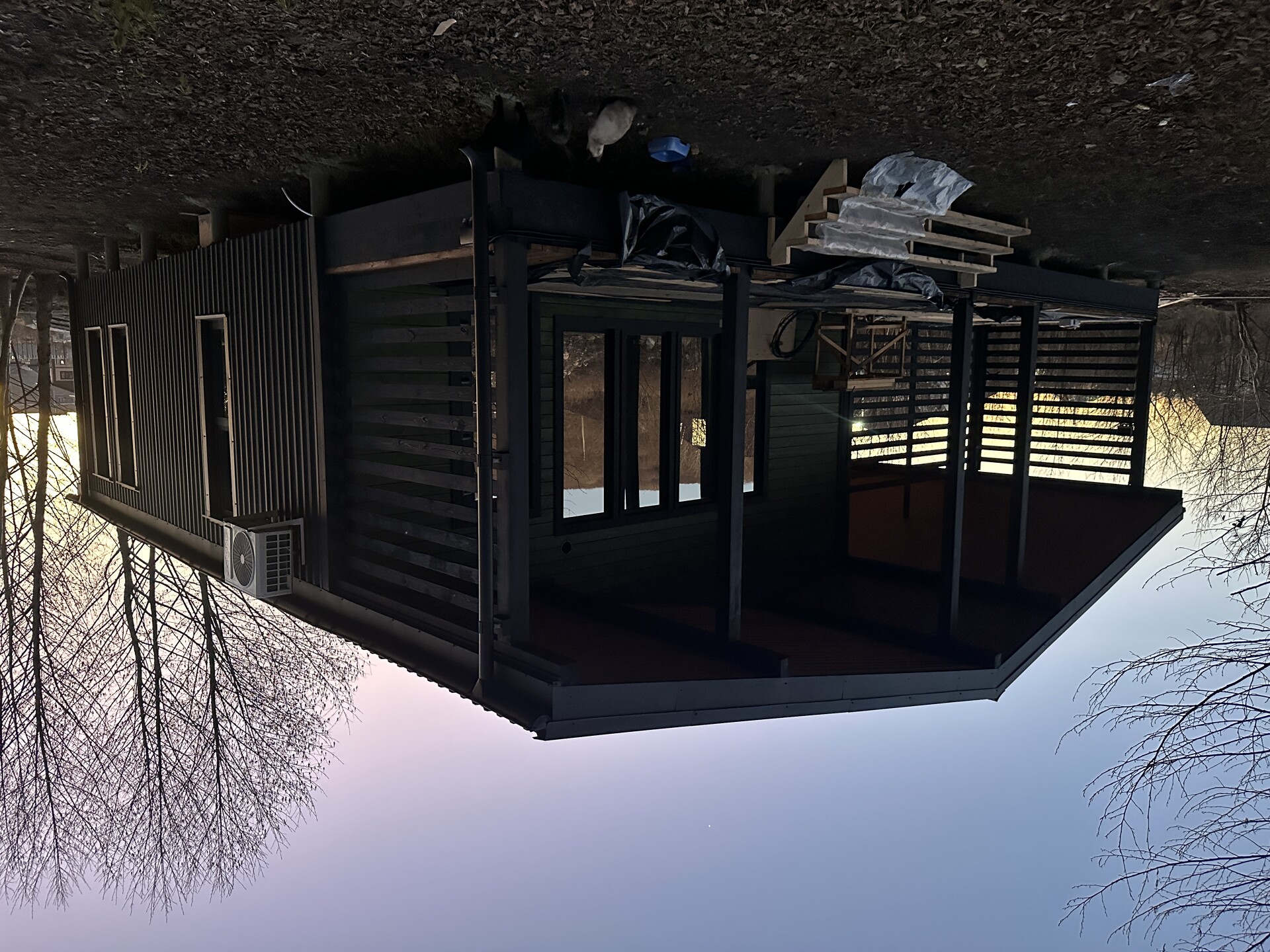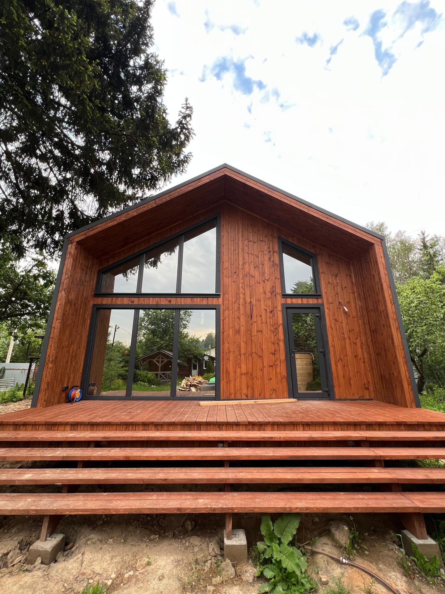 - Отделка фасадных частей дома производится имитацией бруса 17x140(карельский профиль).Предварительно осуществляется покраска всех фасадных элементов перед монтажом.