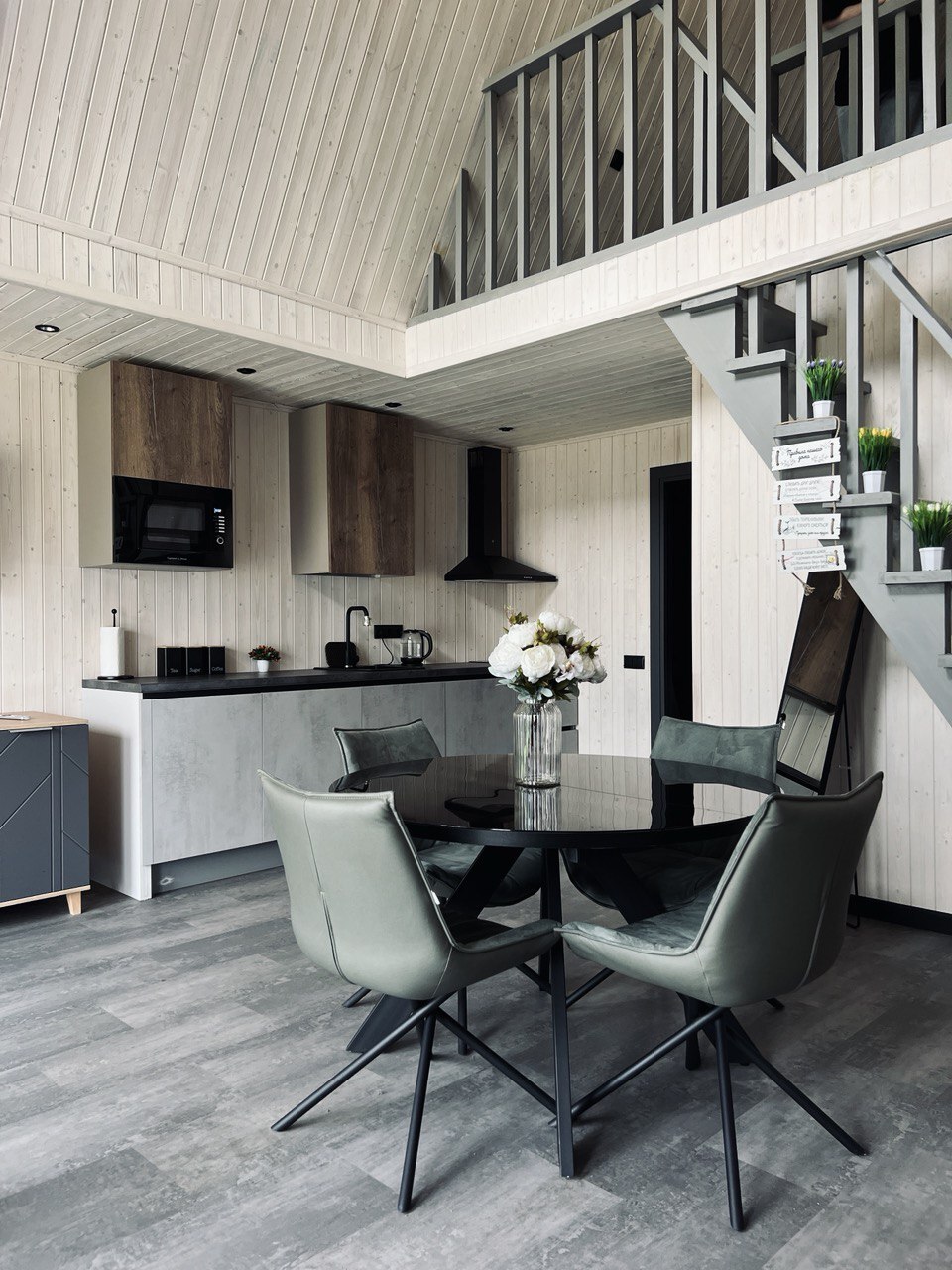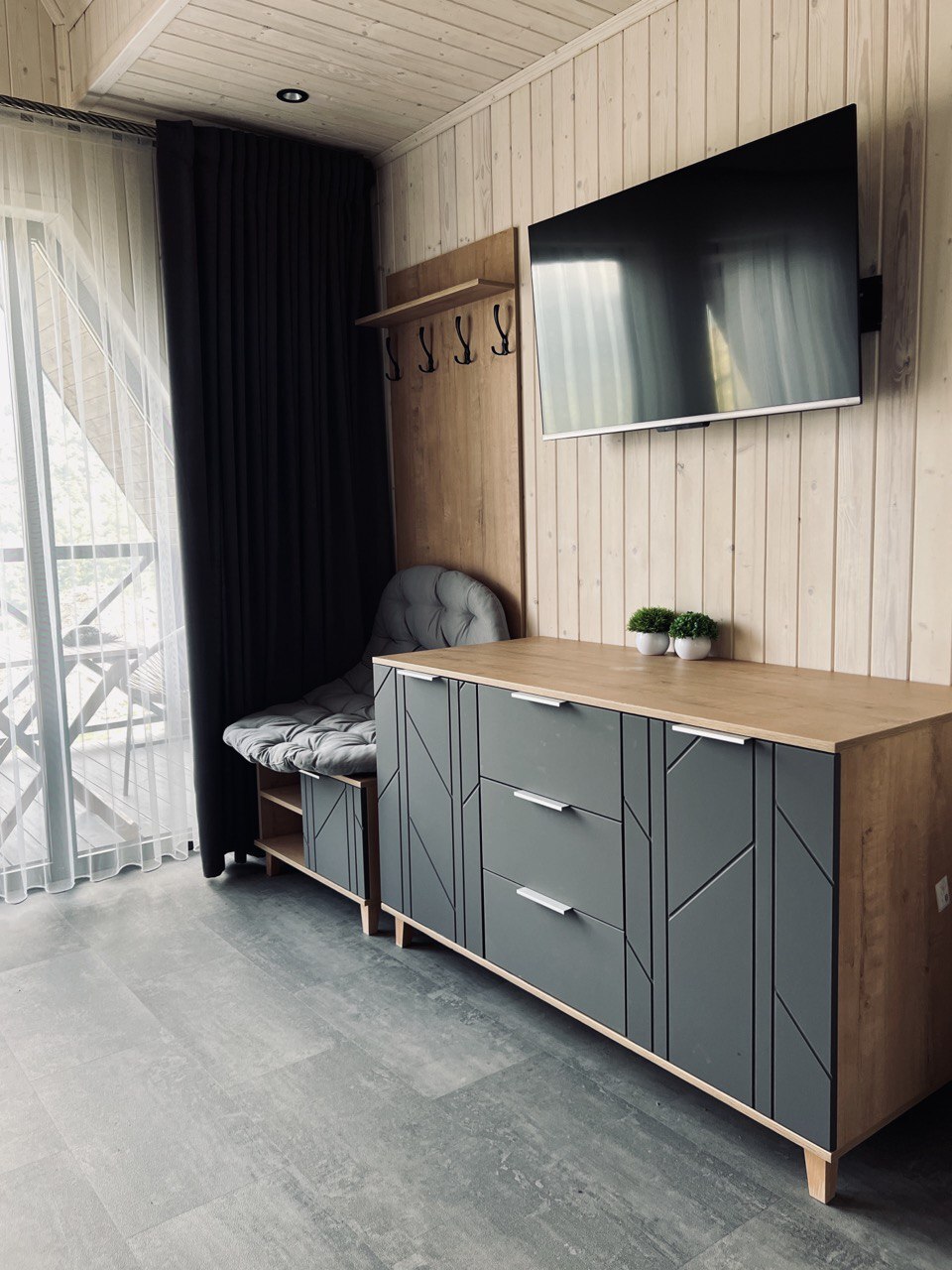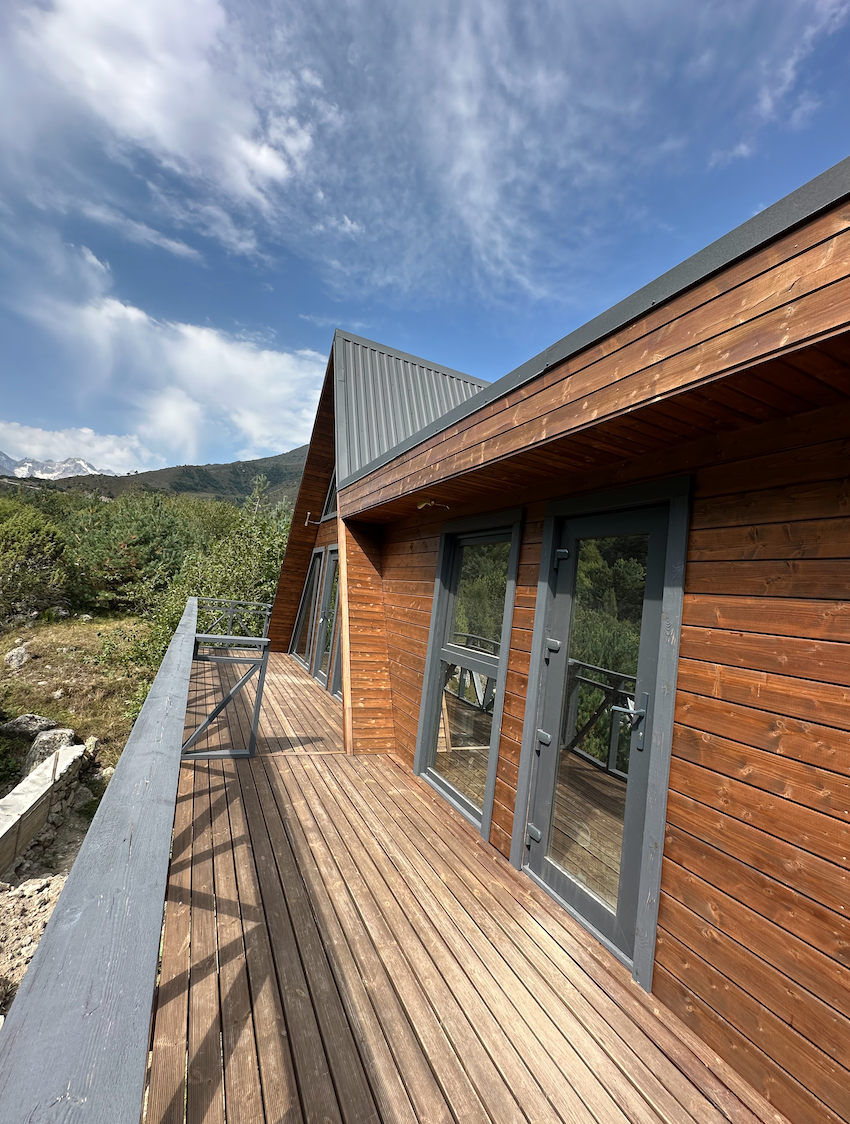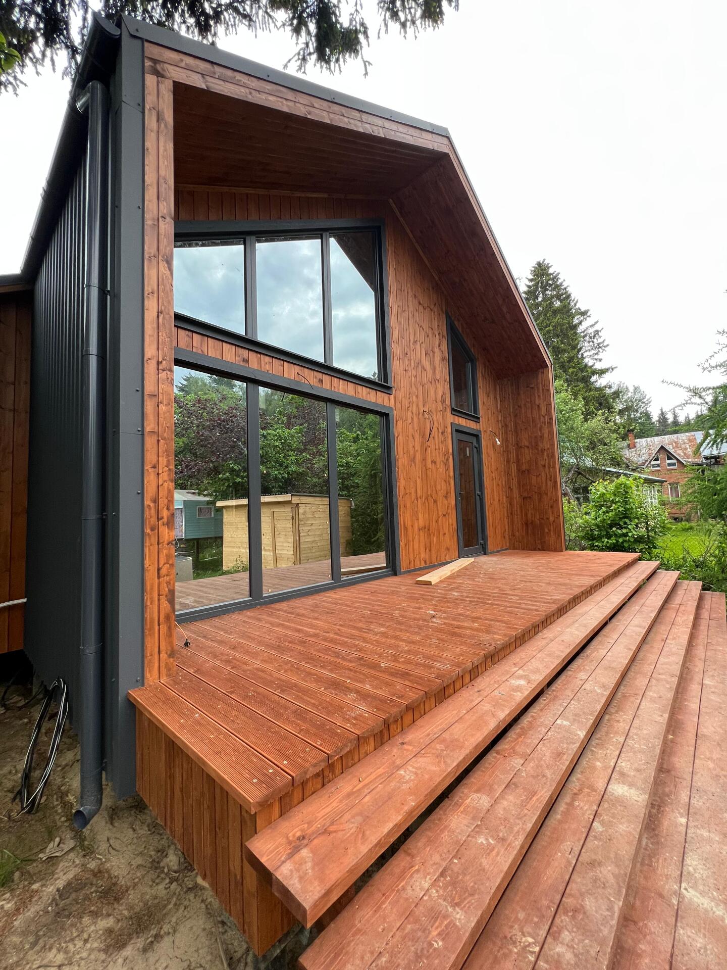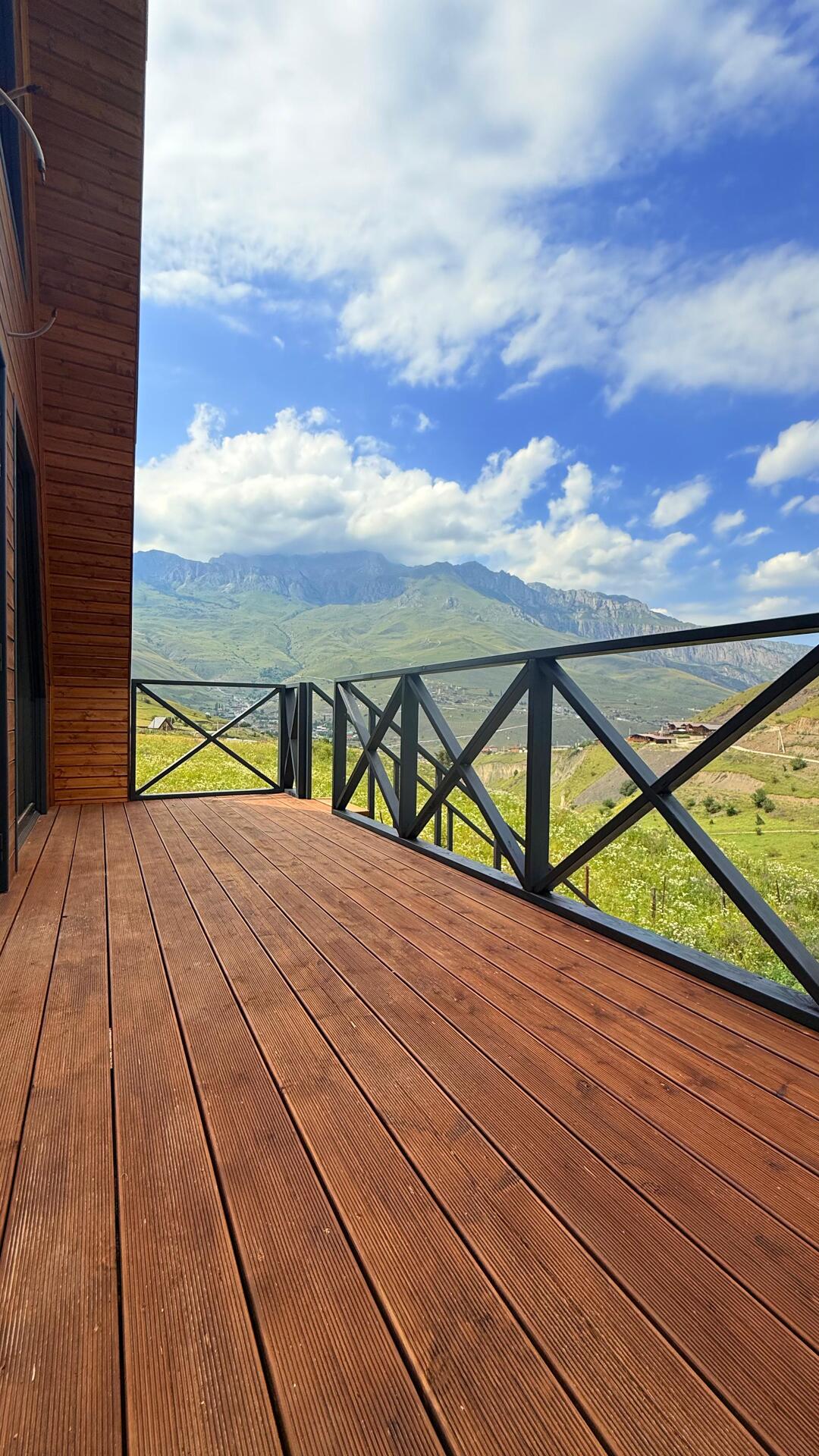 - Терраса : Отделывается по периметру имитацией̆ бруса. Полы на террасе и балконе из специальной композитной террасной доски 135 х 25 мм. с промежутками 5 мм.
