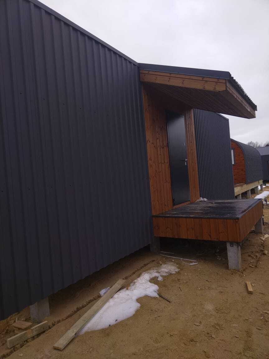 -Отделка фасадных частей дома производится имитацией бруса 17x140(карельский профиль).Предварительно осуществляется покраска всех фасадных элементов перед монтажом.