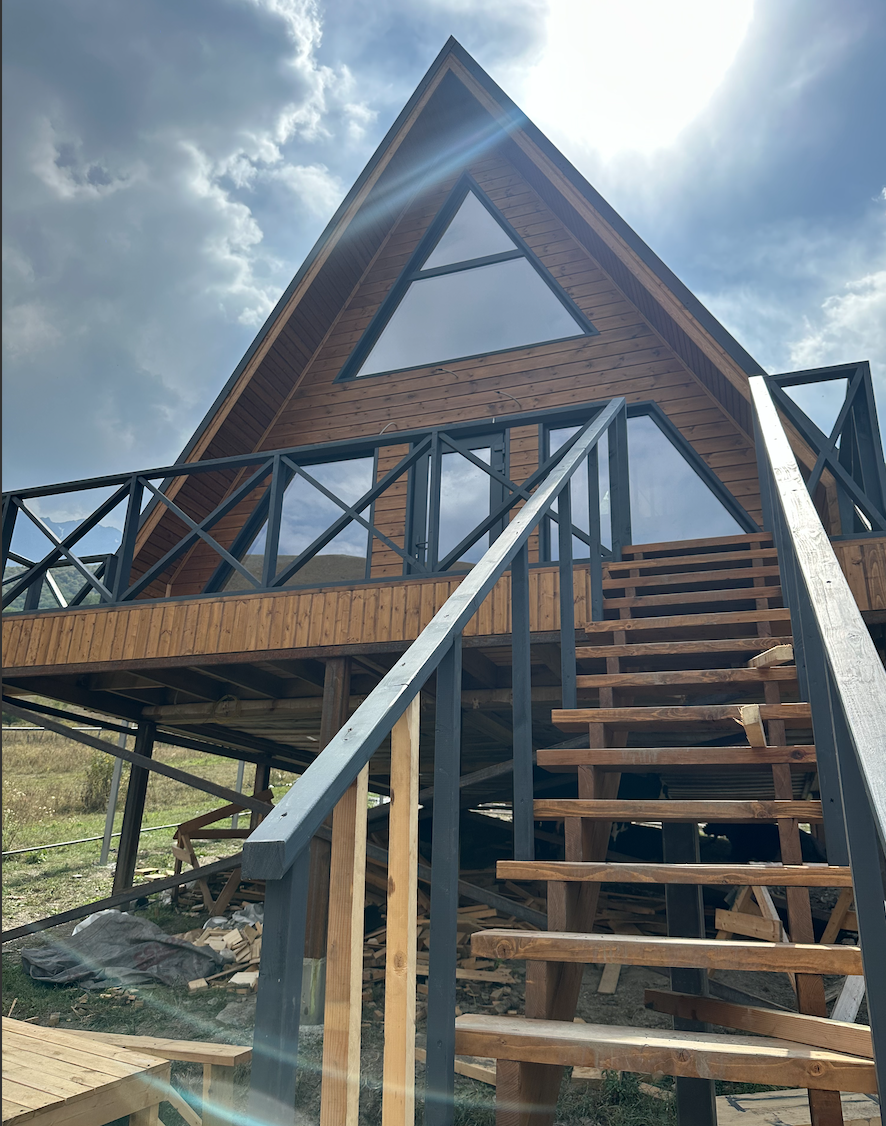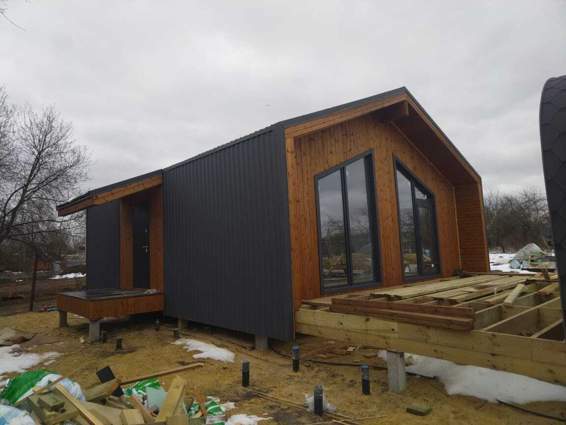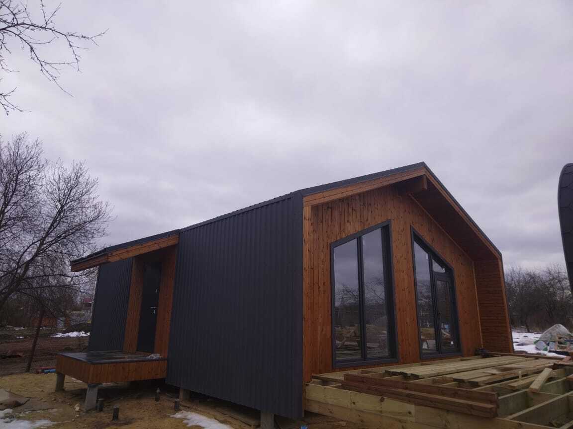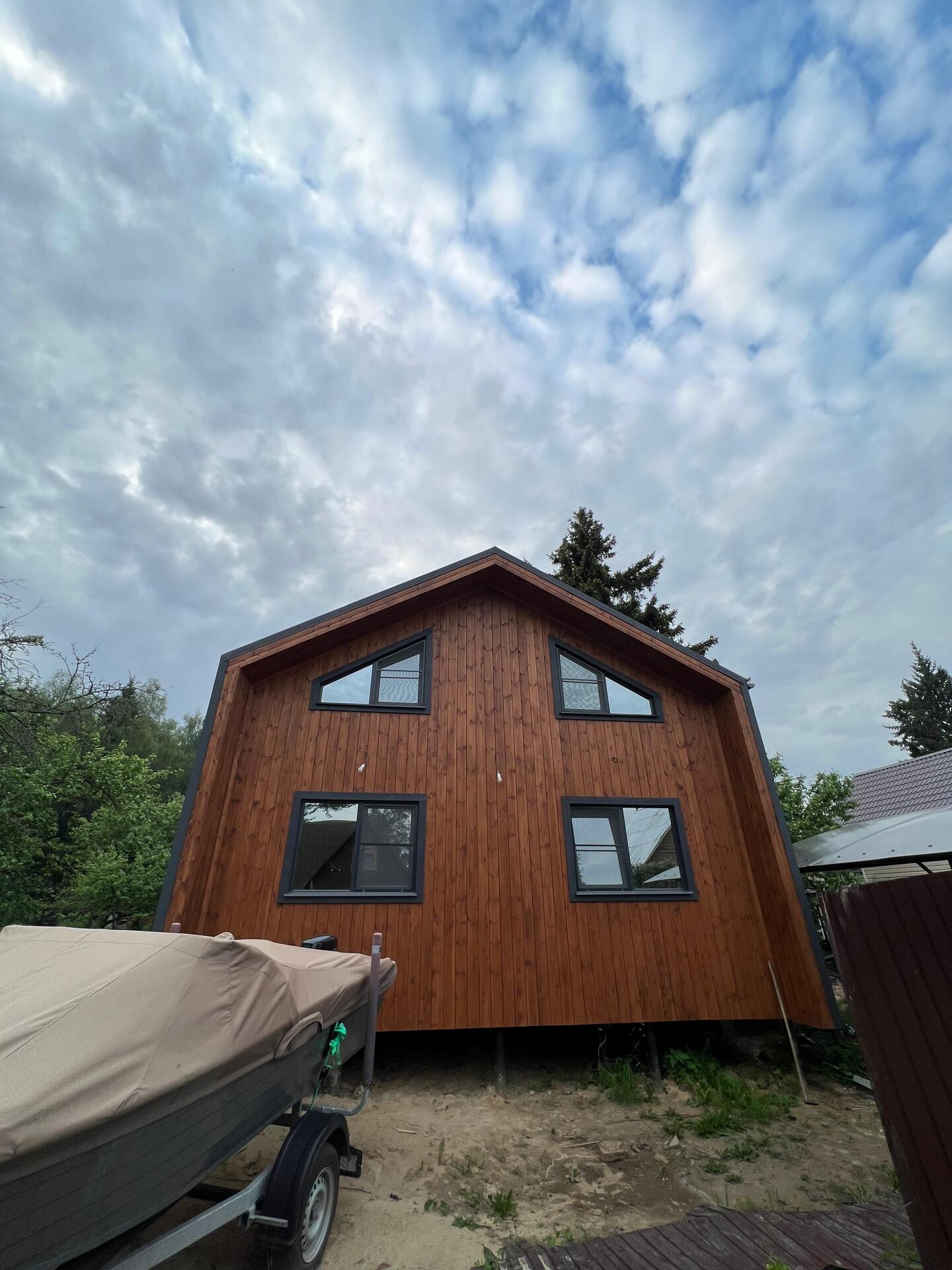 -Отделка фасадных частей дома производится имитацией бруса 17x140(карельский профиль).Предварительно осущетсвляется покраска всех фасадных элементов перед монтажом.