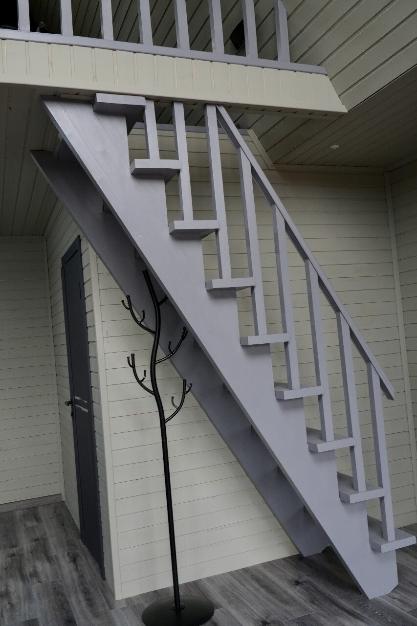 - Лестница для подъема на второй этаж и клееной тетевы и клееных ступеней. Производится монтаж перилы и балясин на лестницу.